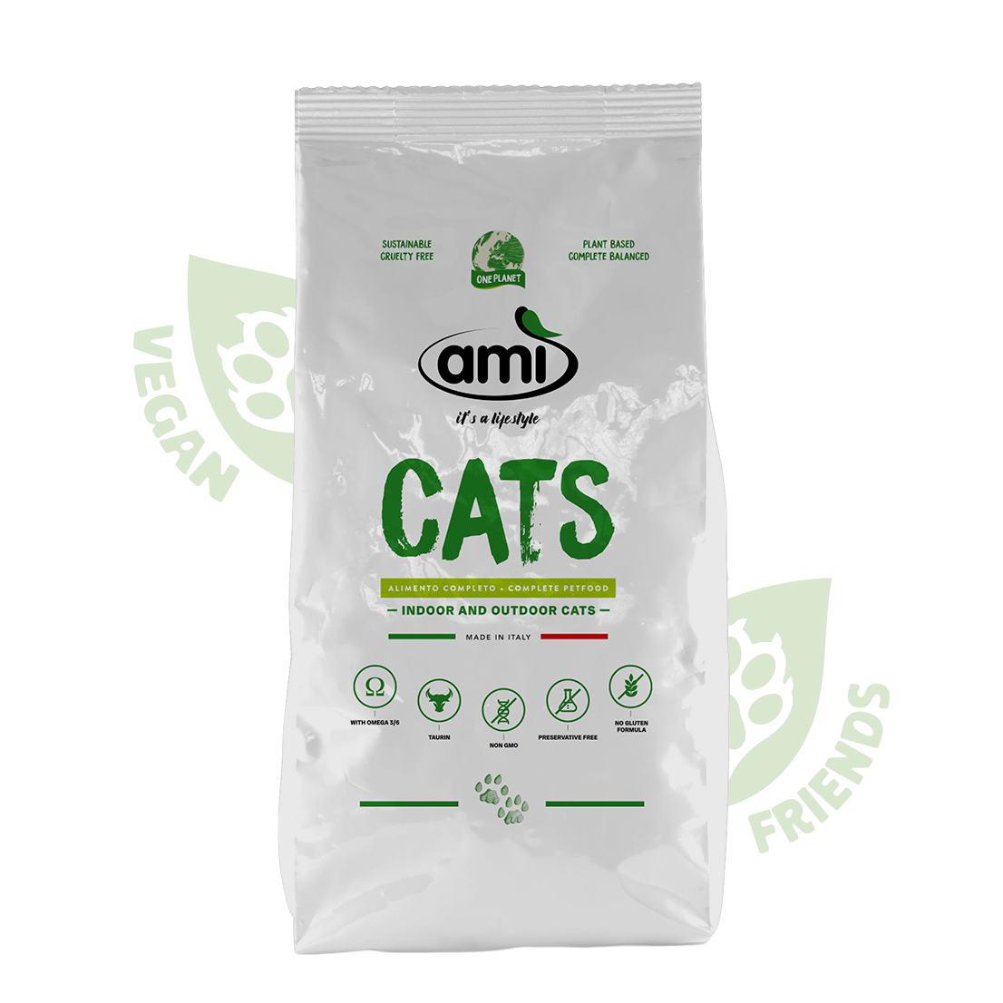 Ami Cats — повноцінний веганський сухий корм для дорослих котів від італійського бренду Ami, який понад 20 років створює рослинні раціони для домашніх улюбленців. Цей збалансований корм забезпечує всі необхідні поживні речовини для щоденного здоров’я котів завдяки рослинним білкам, таурину (важливому для серця та зору), омега-3 і омега-6 жирним кислотам (для шкіри та шерсті) та цинку (для імунітету). Легко засвоюється, підходить для чутливих котів. Рослинний раціон Ami сприяє загальному благополуччю, енергії та довголіттю вашого улюбленця без компромісів. Ідеальний вибір для етичного та екологічного харчування котів в Україні з доставкою на адресу, поштомат чи відділення від першого в країні веганського етичного рослинного зоомагазину кормів для котів та собак Vegan Friends.
