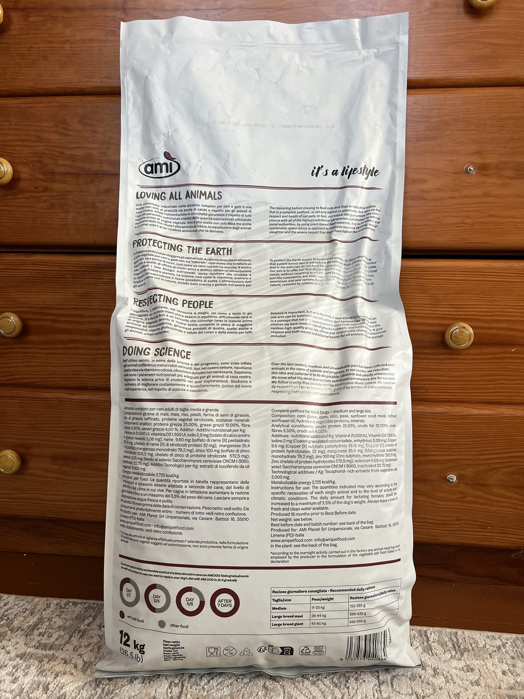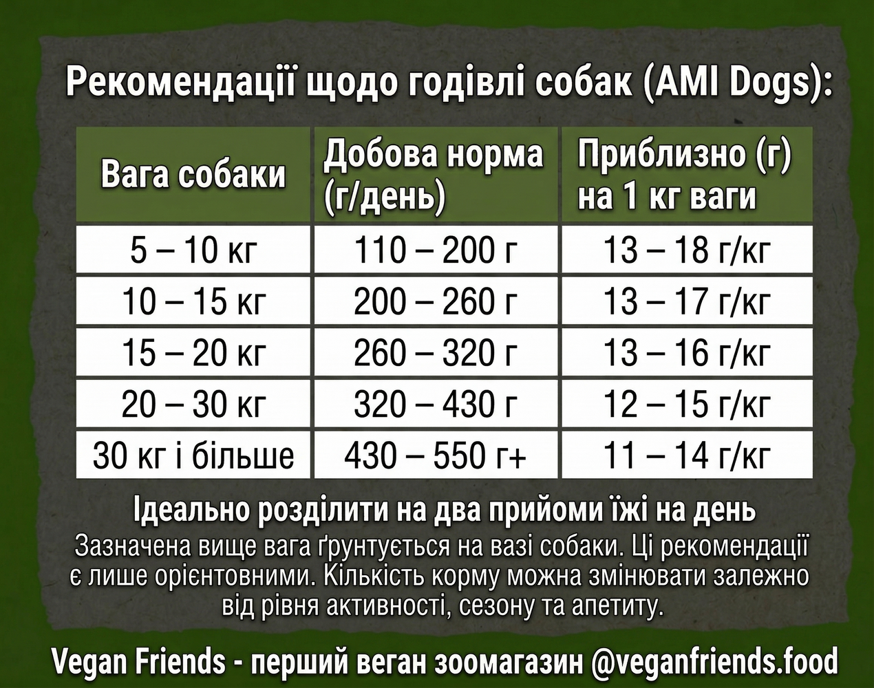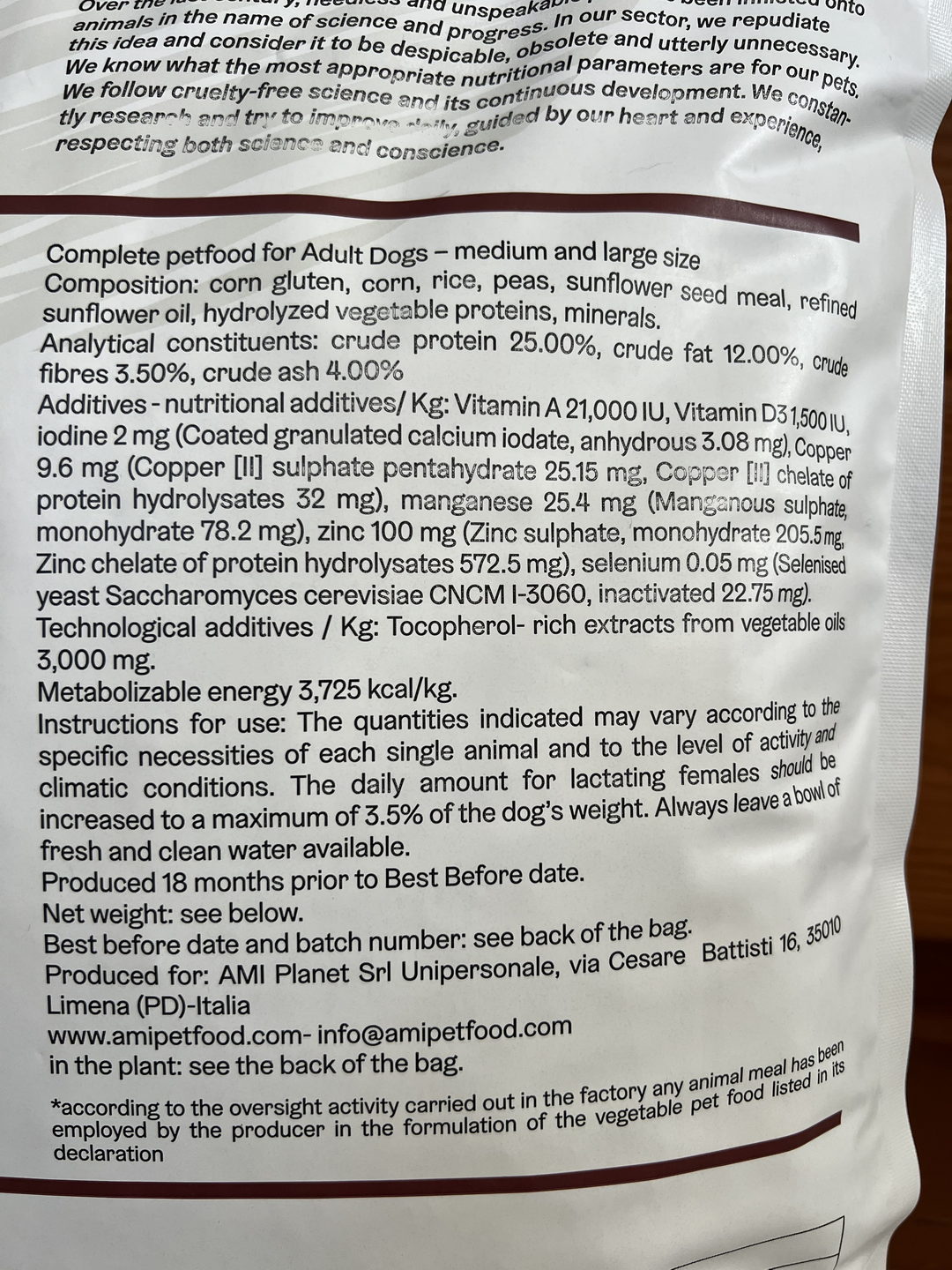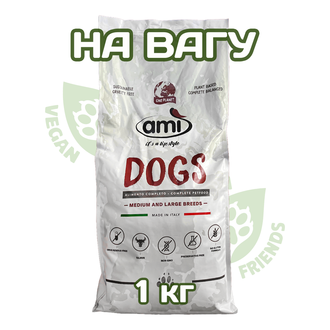 Ami Dogs — повноцінний веганський сухий корм для дорослих собак середніх та великих порід від італійського піонера рослинного харчування Ami (понад 20 років досвіду). Формула з рослинними білками, омега-3 та омега-6, L-карнітином та вітаміном E забезпечує щоденну енергію, здоров’я суглобів, шкіри та шерсті. Легко засвоюється, гіпоалергенний, без глютену. Багаторічний досвід Ami доводить: збалансований рослинний раціон покращує самопочуття собак, сприяє чистому диханню та довголіттю. Етичний вибір для турботливих господарів — доставка по Україні!