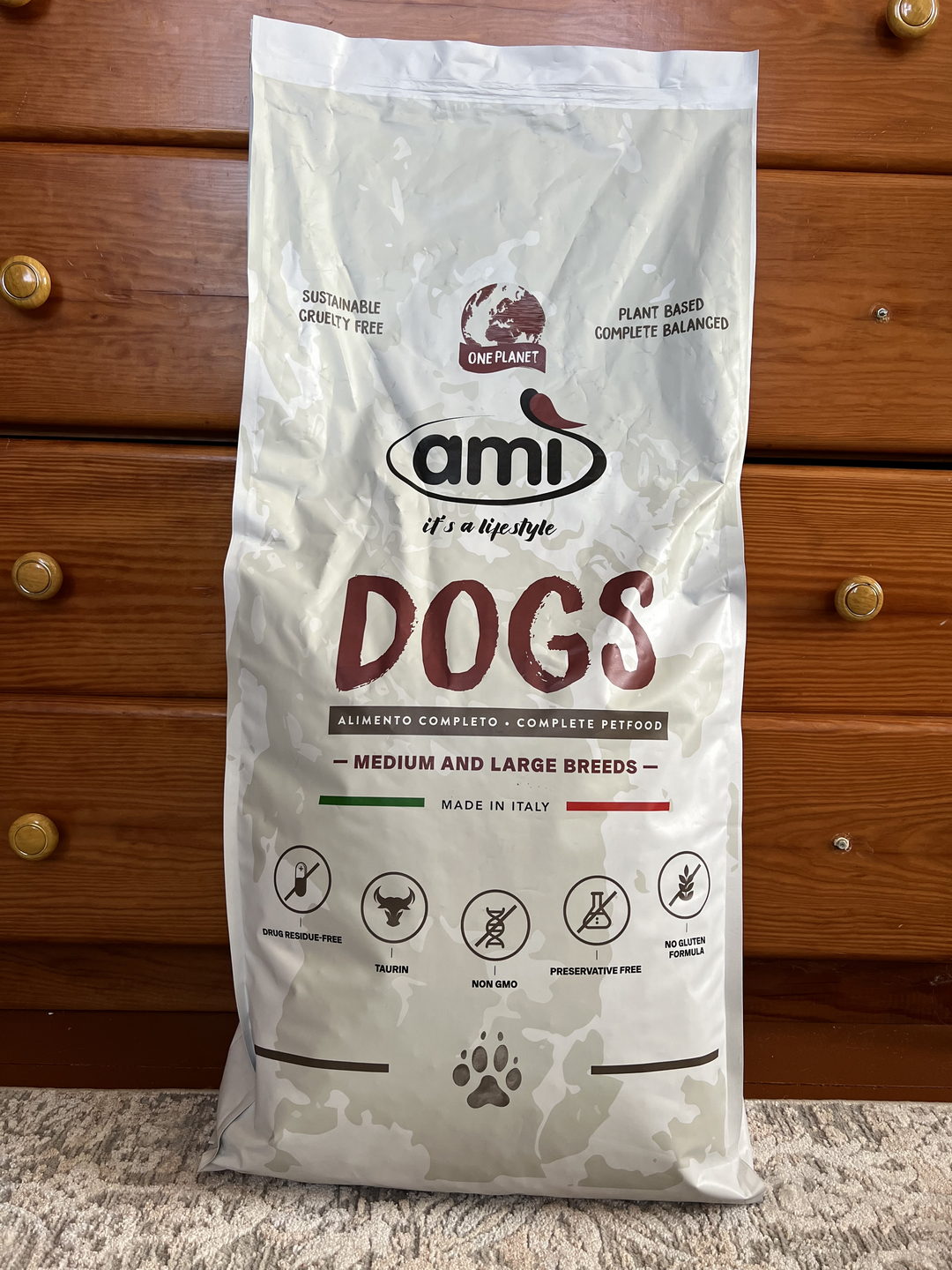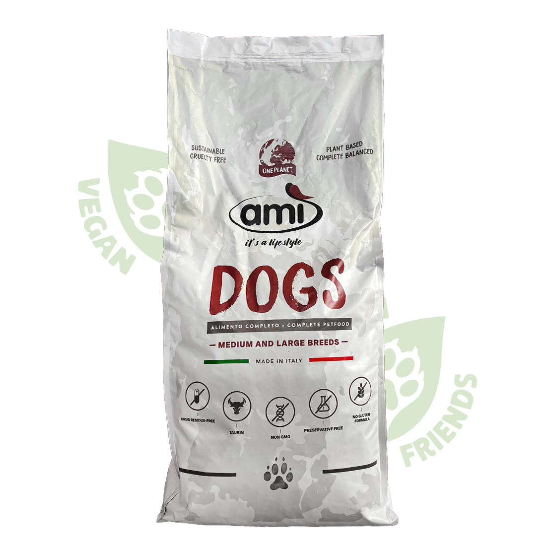 Ami Dogs — повноцінний веганський сухий корм для дорослих собак середніх та великих порід від італійського піонера рослинного харчування Ami (понад 20 років досвіду). Формула з рослинними білками, омега-3 та омега-6, L-карнітином та вітаміном E забезпечує щоденну енергію, здоров’я суглобів, шкіри та шерсті. Легко засвоюється, гіпоалергенний, без глютену. Багаторічний досвід Ami доводить: збалансований рослинний раціон покращує самопочуття собак, сприяє чистому диханню та довголіттю. Етичний вибір для турботливих господарів — доставка по Україні!