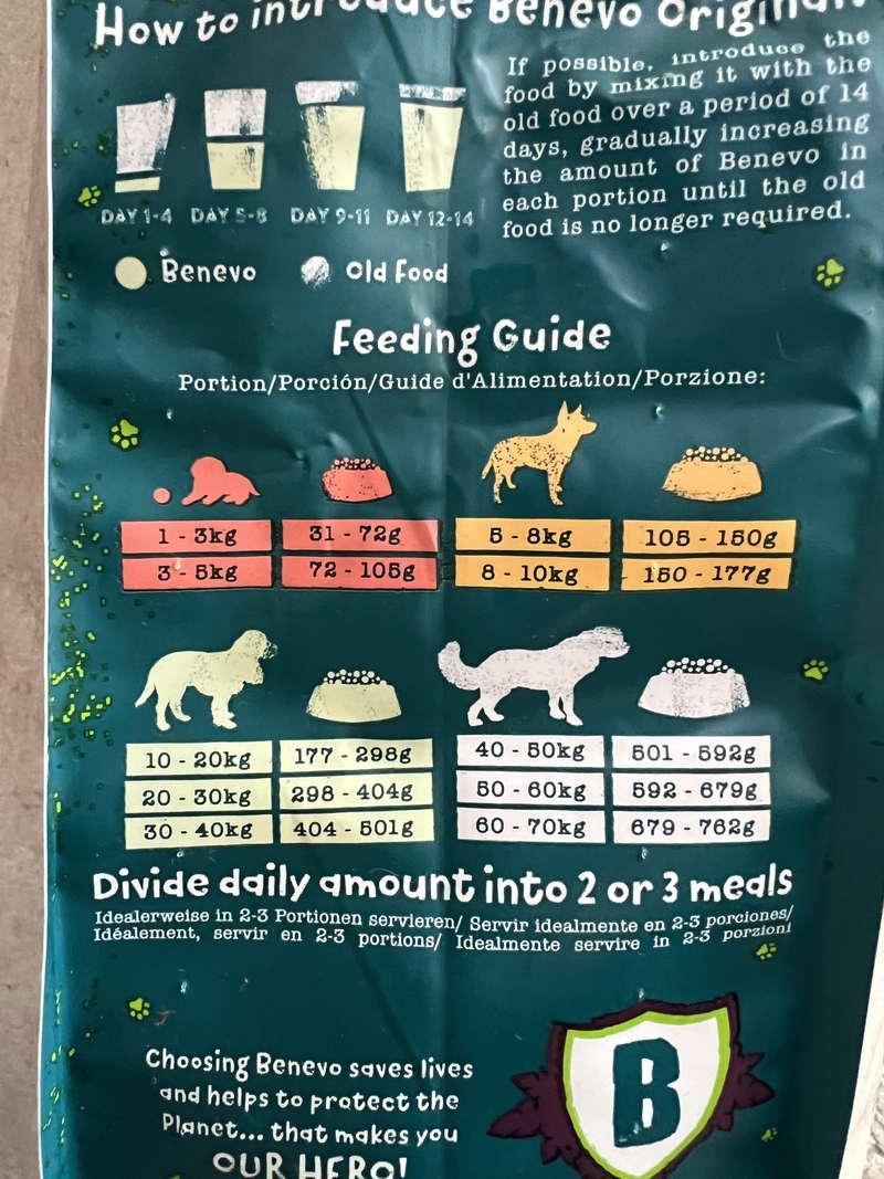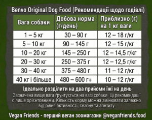 Рекомендації щодо годування: Добова норма залежить від ваги та рівня активності тварини (див. таблицю на зворотному боці упаковки).