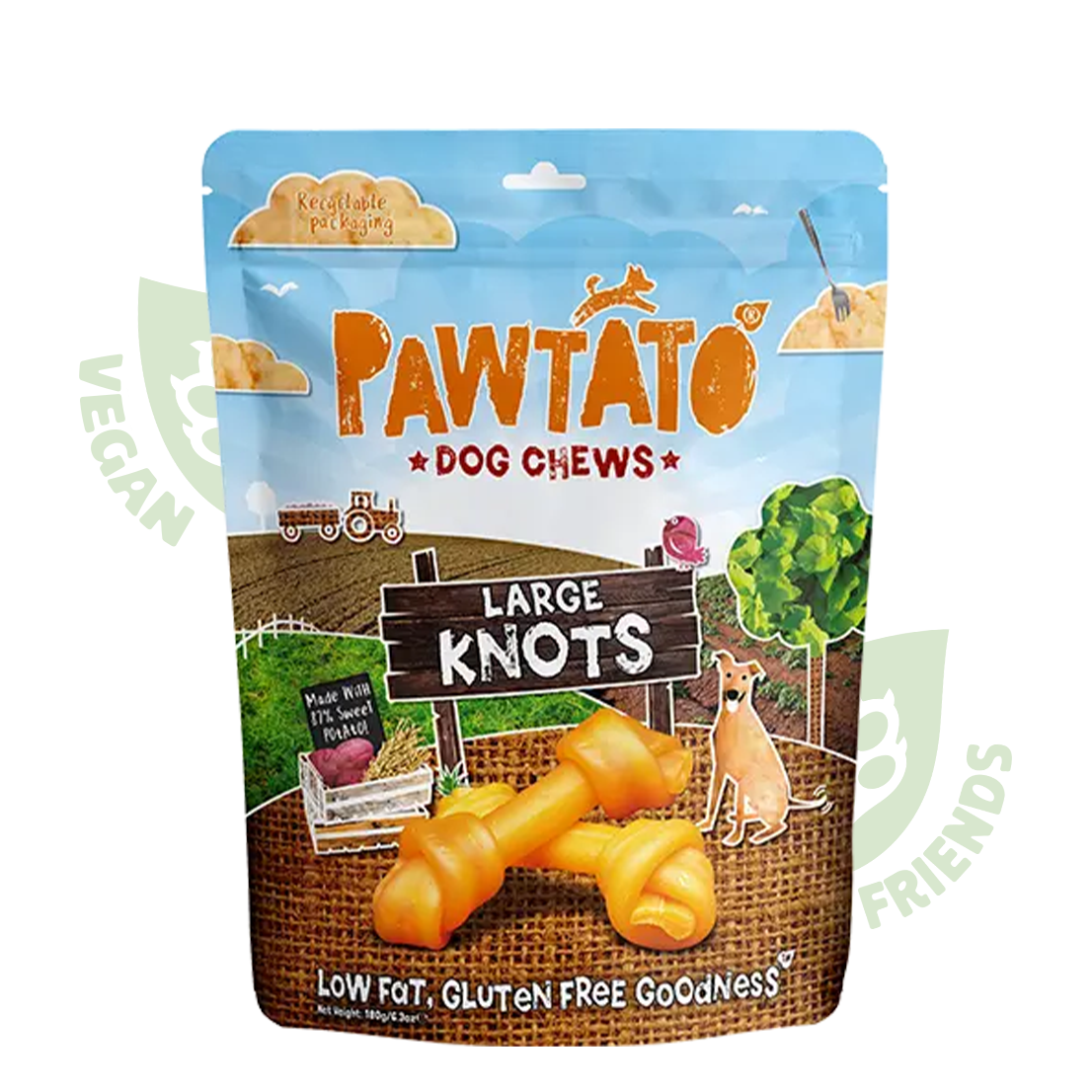 Pawtato DC Large Knots — великі веганські жувальні вузли для собак з 87% солодкої картоплі. Натуральні, гіпоалергенні, легко засвоюються, підтримують зуби та ясна завдяки текстурі та корисним речовинам солодкої картоплі (антиоксиданти, вітаміни).