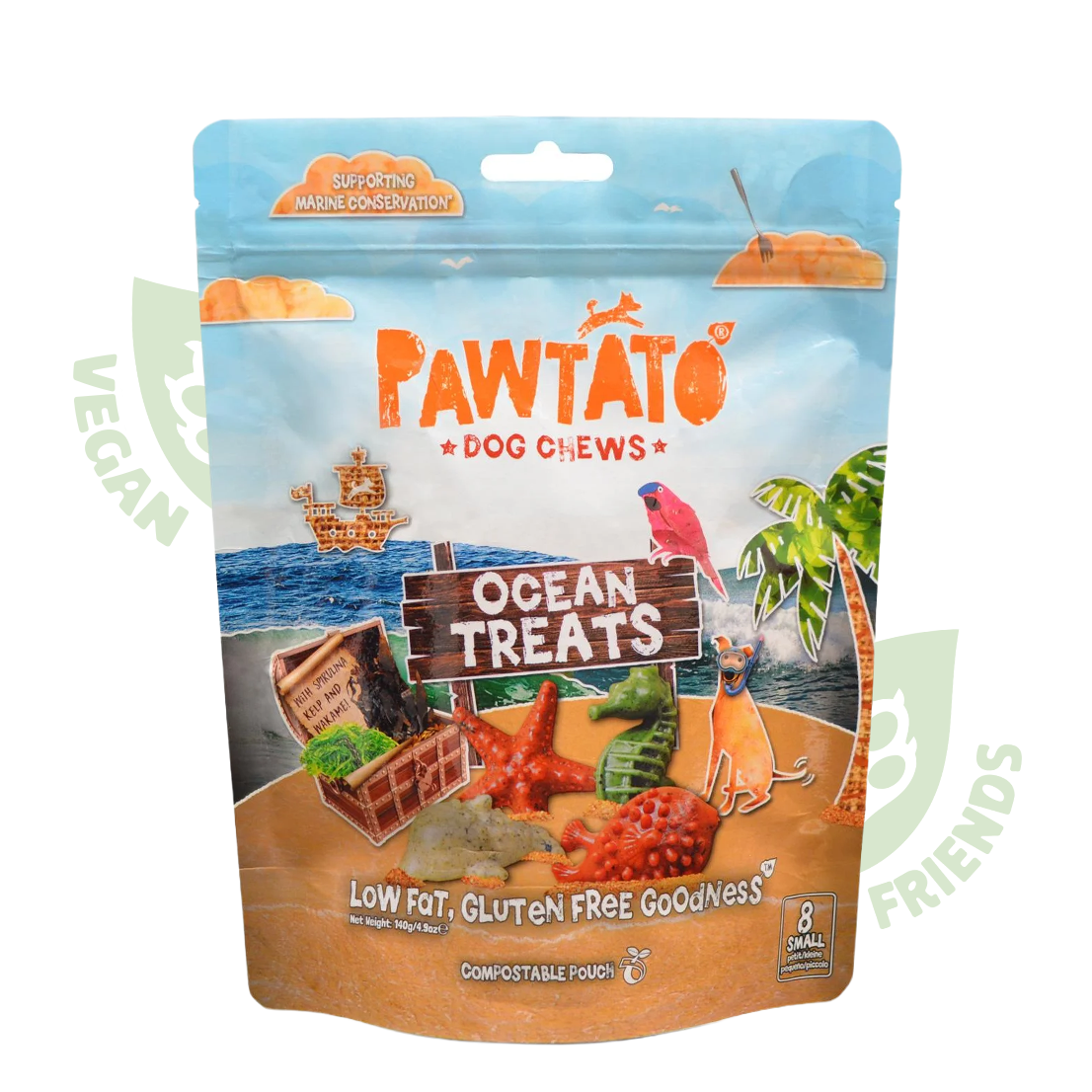 Pawtato DC Ocean Treats — веганські ласощі у формі морських істот з солодкої картоплі, гороху та сушених водоростей (спіруліна, вакаме, келп — вирощені на суші). Підтримують імунітет, шкіру та шерсть завдяки натуральним мінералам і антиоксидантам. Низькожирні, без ГМО.