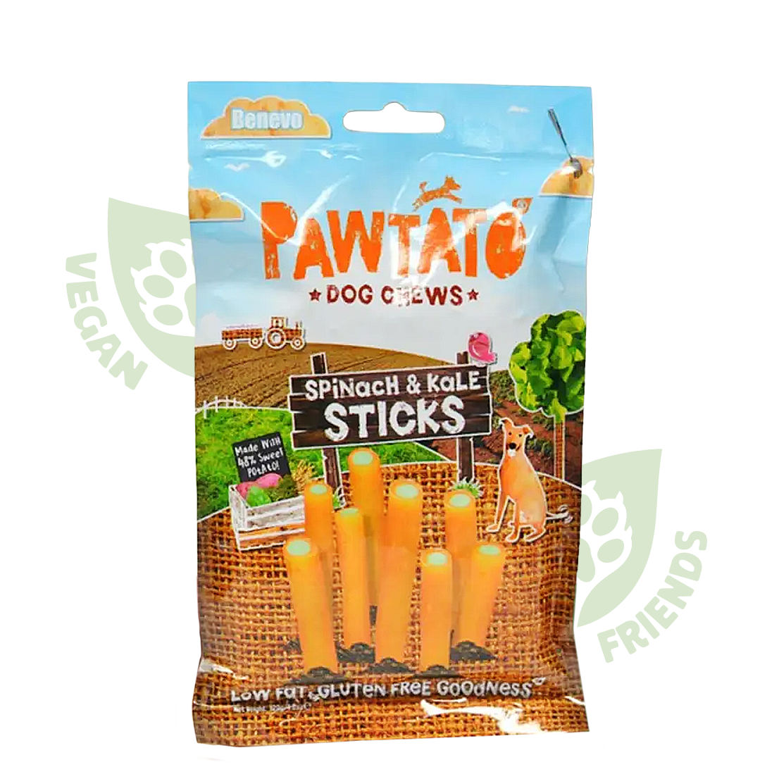Pawtato Spinach & Kale Sticks — веганські палички для собак зі солодкої картоплі, рису, шпинату та кале. Підтримують травлення, суглоби, імунітет та блискучу шерсть завдяки фітоелементам, вітамінам і антиоксидантам. Низькожирні, гіпоалергенні.